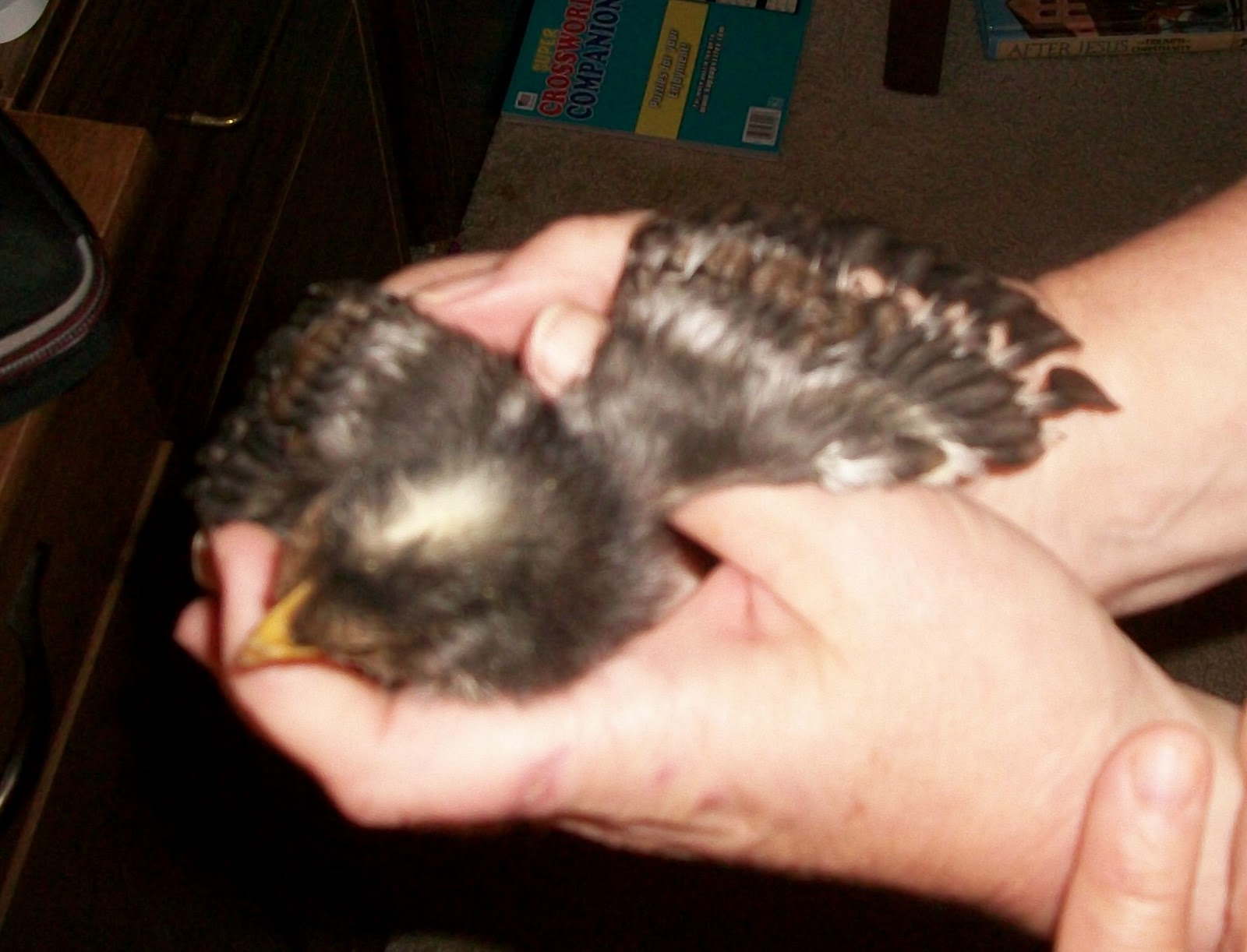 Since Pretty Face wouldn't adopt six of the seven newbies, we listen to a lot of cheep, cheep, cheep in the morning and in the evening, or when the weather isn't suitable for the chicks to be out on the front deck. As I said before, we put the cage on a card table in the office/computer room, and when the chicks get loud, wanting attention, we take them out and hold them.